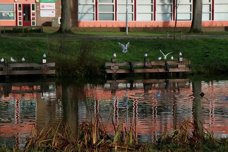當環(huán)境景物的色彩比較鮮艷、豐富時,你好可以嘗試專注于拍攝水面波紋本身,斑駁的色彩與波紋結合會形成漂亮的抽象圖案: