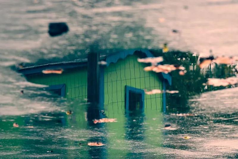 不平靜的水面會產生波紋,導致倒影的形狀發(fā)生變化。你可以利用這些產生變形的景物和實體進行對比,比如說,水中扭曲的建筑物倒影: