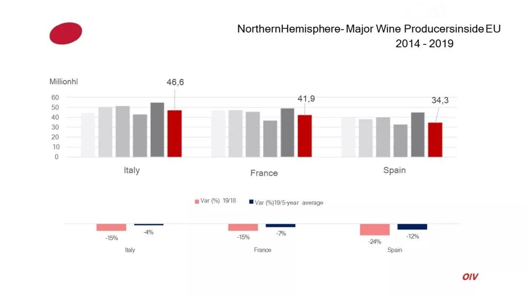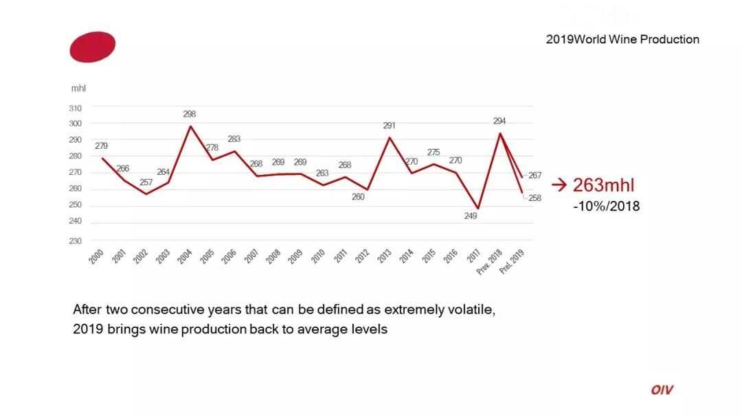 據(jù)國(guó)際葡萄與葡萄酒組織(OIV)最新數(shù)據(jù)顯示,2019年全球葡萄酒產(chǎn)量*為263億升(mhl),同比2018年下降了10.54%。包括法國(guó)、意大利、西班牙在內(nèi)的葡萄酒主產(chǎn)國(guó)產(chǎn)量均有不同程度下降。