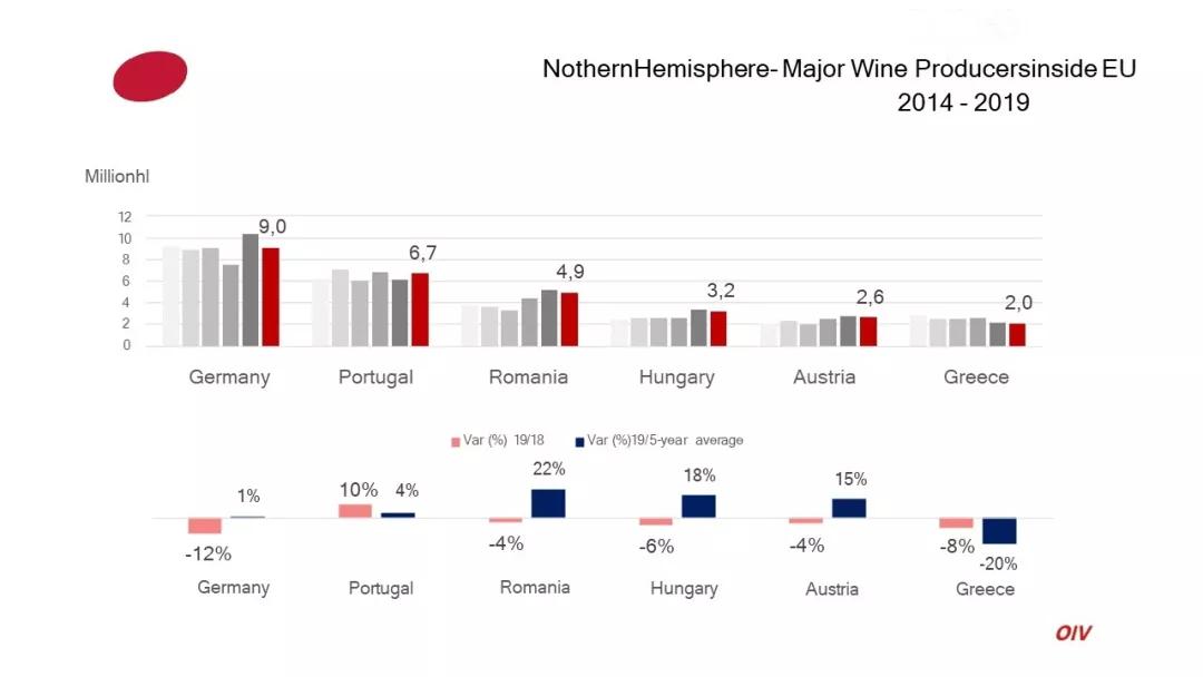 歐盟國(guó)家2019年葡萄酒產(chǎn)量156億升(mhl),占據(jù)全球葡萄酒產(chǎn)量的60%,略低于2014-2016年平均水平。