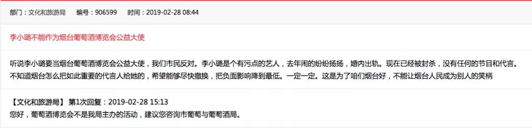 無獨有偶,今年初,煙臺國際葡萄酒博覽會想推陳出新,于是邀請李小璐擔任第十二屆煙臺國際葡萄酒博覽會的公益大使,希望“李小璐將利用她在巨大的粉絲影響力在中國全力推廣煙臺酒博會?!?/span>