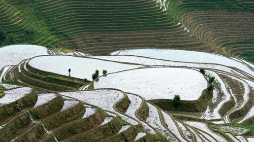 隨著朝陽(yáng)逐漸爬上藍(lán)天,梯田中濃濃的水汽也慢慢化開(kāi),像是一滴白滴入了金的底色,在這精致的春景中一點(diǎn)點(diǎn)地蔓延開(kāi)來(lái),飄飄欲仙,美如仙境;