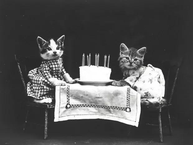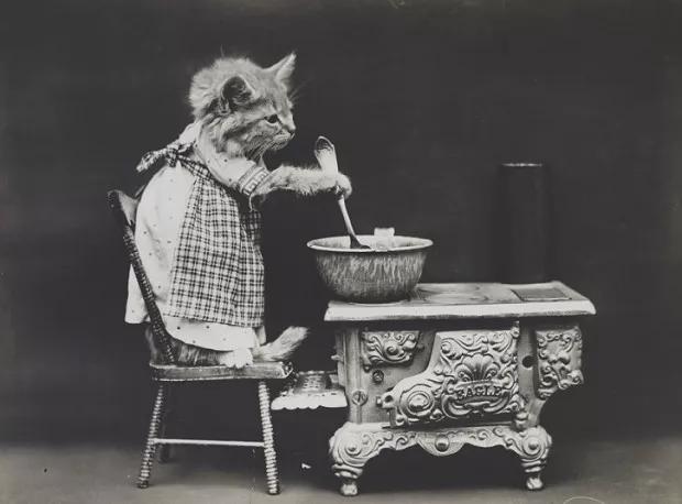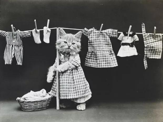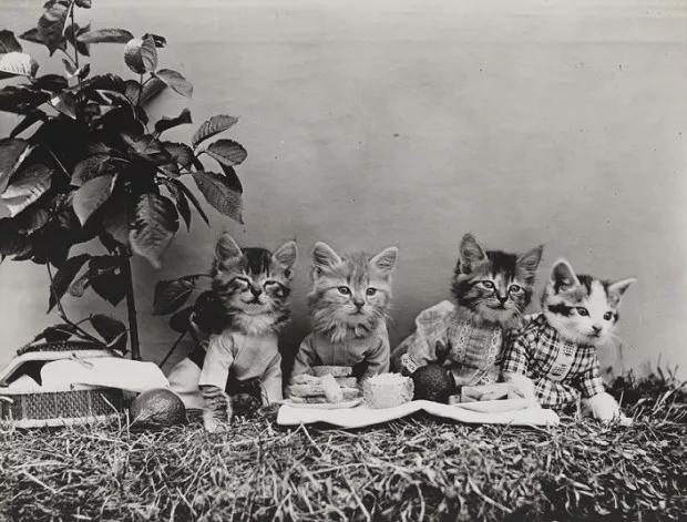 請大家放心,據(jù)當(dāng)時(shí)媒體報(bào)道,貓咪穿的衣服都是弗里斯母親縫制的,外表看起來是普通的衣服,內(nèi)部其實(shí)是和背景布相連的小口袋。還有一些小道具可以將貓咪的動(dòng)作固定。