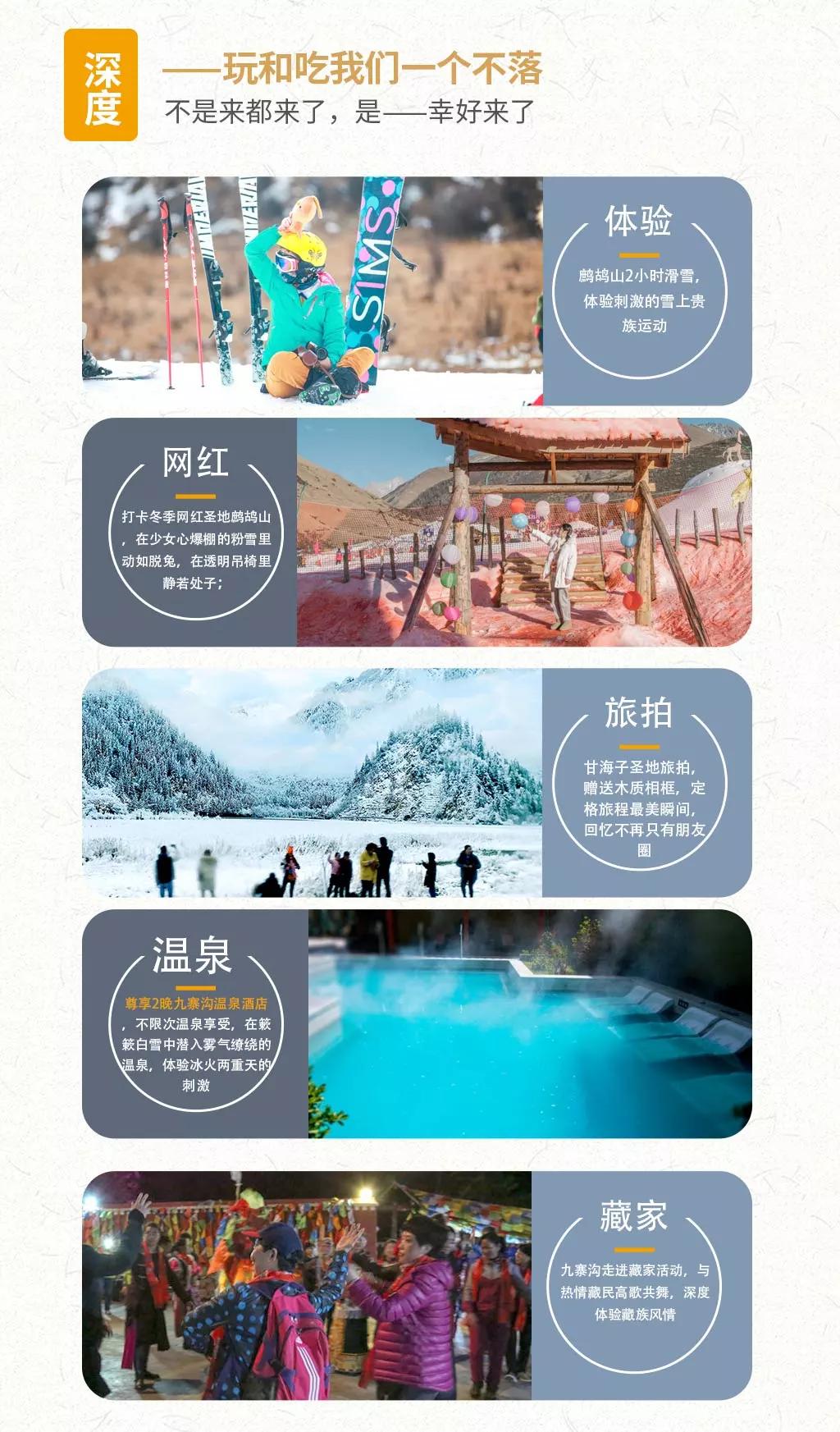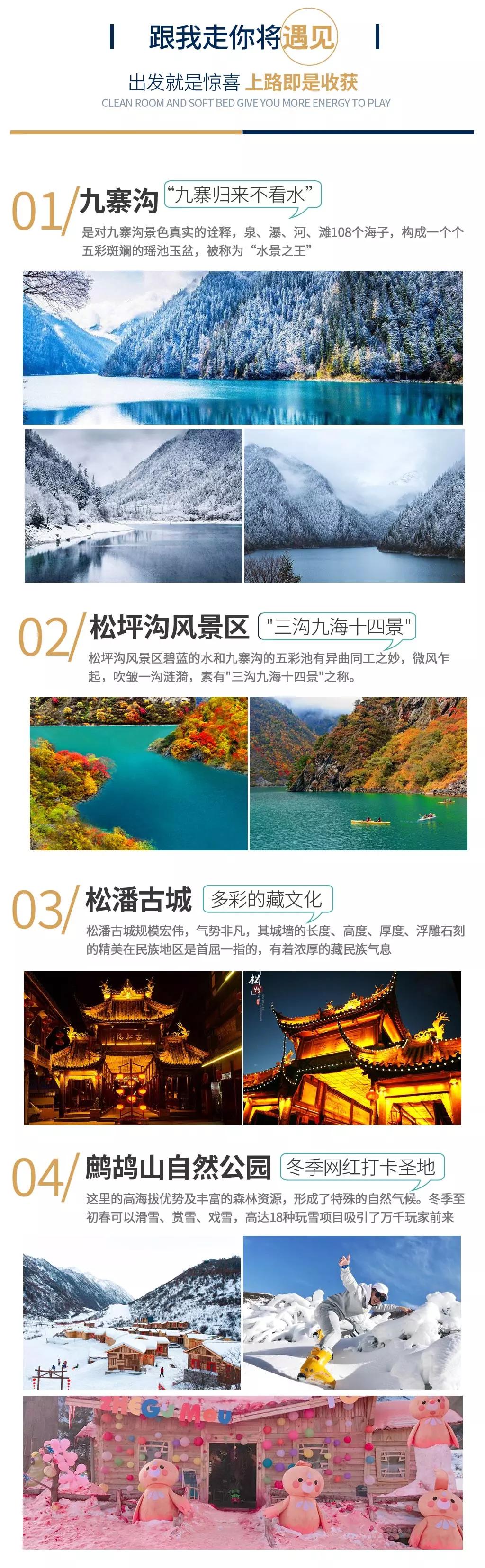 當日行程:九寨溝得名于溝內(nèi)有九個藏族村寨,以“九寨六絕”——翠湖、疊瀑、彩林、雪峰、藏情、藍冰而聞名天下。遠望雪峰林立,白雪皚皚;近看碧水澄澈,清可見底;除卻如夢似幻的自然景觀,還有藏家木樓、晾架經(jīng)幡、棧橋、磨房、藏族習俗及神話傳說構成的人文景觀,也因這不二的美,你能在這里見到許多熱門影視劇里的取景場地。冬季的九寨溝變得尤為寧靜,也更具詩情畫意,山巒與樹林銀裝素裹,瀑布變成了一幅幅巨大的天然藝術冰雕如此潔白而高雅的世界,錯開擁擠的游人,卻能收獲一個觀賞九寨六絕之“藍冰”和“雪峰”的最好時機。