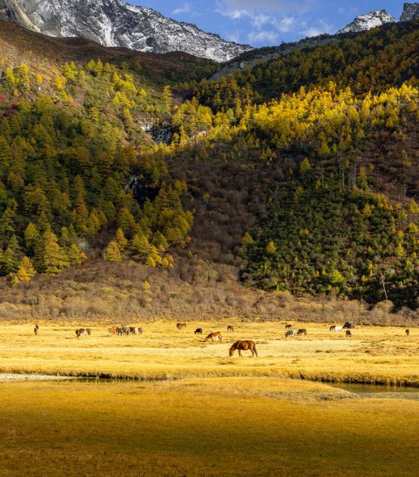牛場被三座神山環(huán)繞,貢嘎河從中穿梭,到處是牧場木屋,原始而又迷人,是攝影家的天堂。