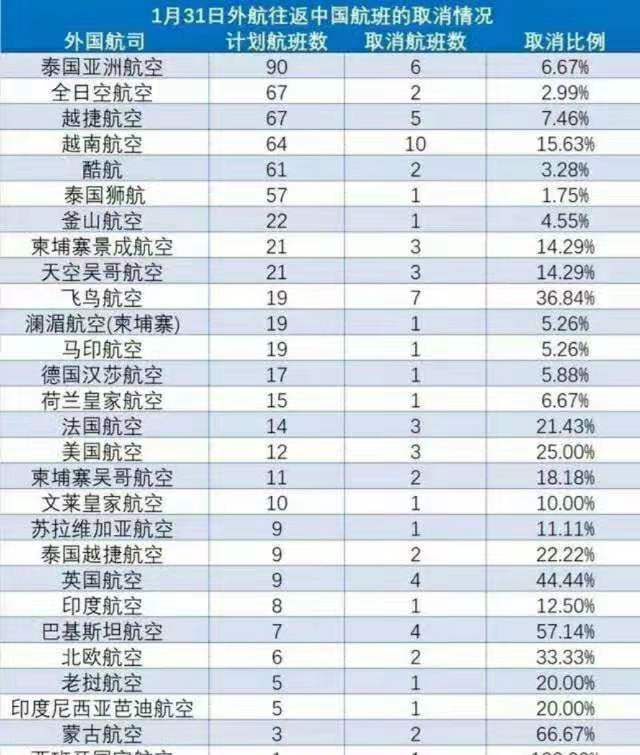 1月31日,120家國際航司計劃執(zhí)行1838個中國國際航班,其中28家航空公司共取消72個中國國際航班。
