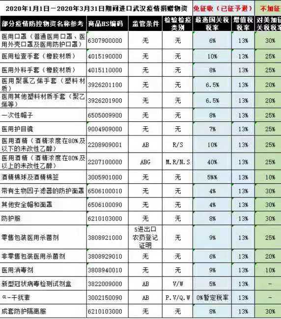 5、進(jìn)口且原產(chǎn)于美國的物資,不實施對美加征關(guān)稅措施,已加征稅款予以退還(2020.1.1-2020.3.31)。簡而言之,就是海關(guān)不僅為疫情物資開放綠色清關(guān)通道,還免所有進(jìn)口稅費(企業(yè)自用或用于銷售的防護(hù)物資不適用“捐贈物資”監(jiān)管方式,依然要繳納相關(guān)稅費)。