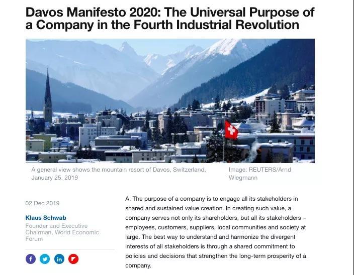 “這是世界經(jīng)濟(jì)論壇50年前成立的初衷,”施瓦布堅(jiān)信,“也是我們?cè)谖磥?lái)50年努力的方向?!?大公司已開(kāi)始重新思考自己的價(jià)值。