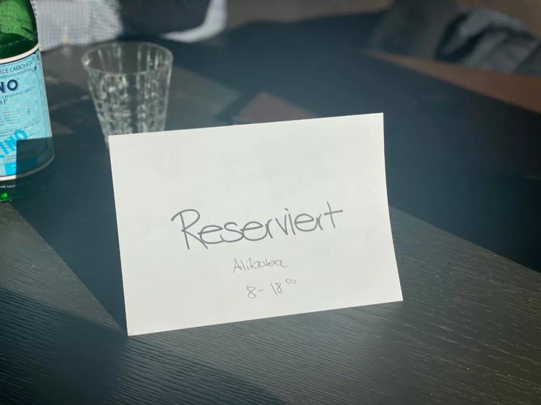 這是達(dá)沃斯小鎮(zhèn)離雪景名勝魔環(huán)山不遠(yuǎn)處一個(gè)餐廳里,一張小咖啡桌上貼著預(yù)定的標(biāo)簽。
