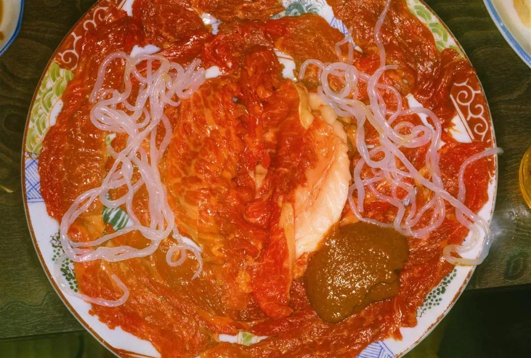 日本攝影家荒木經(jīng)惟有一組名為《盛宴》(The Banquet, 1993)的作品,選取四張,模樣都有點張揚,其中一盤最為生猛,能讓一路看過來已經(jīng)懷念肉食的觀眾趕緊轉(zhuǎn)頭再看幾眼水果。當(dāng)今的食物照片多數(shù)用于傳播和分享,絕大多數(shù)都以精致面目示人,這樣一組照片通過近乎冒犯的方式提醒觀眾:不僅食物本身,就連食物的呈現(xiàn)其實都是多樣的。