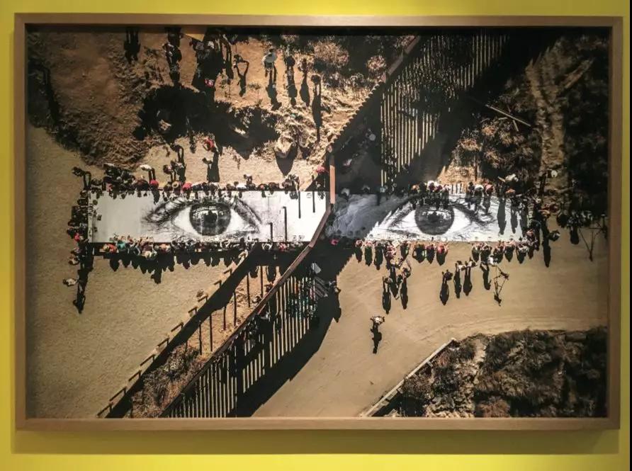 這種平靜馬上被接下來的作品打破。法國藝術(shù)家JR在 2017 年拍攝于美國與墨西哥邊境的作品《移民,梅拉,穿越邊境的野餐》(Migrants, Mayra, Picnic Across the Border)直接以一雙眼睛和觀眾對視。照片從空中俯拍,應(yīng)該由無人機完成,細看之下,這雙眼睛印在一張有兩種形態(tài)的餐桌上,一種是堅硬的桌子,另一種是柔軟的桌布。桌子和桌布并未真正相接,但因為視覺和情感上的慣性,把它們看作是一張穿越了邊境的餐桌。與這張餐桌對視,有那么一刻,可以忽視墻的阻隔,只看見這些同吃同喝的人們。