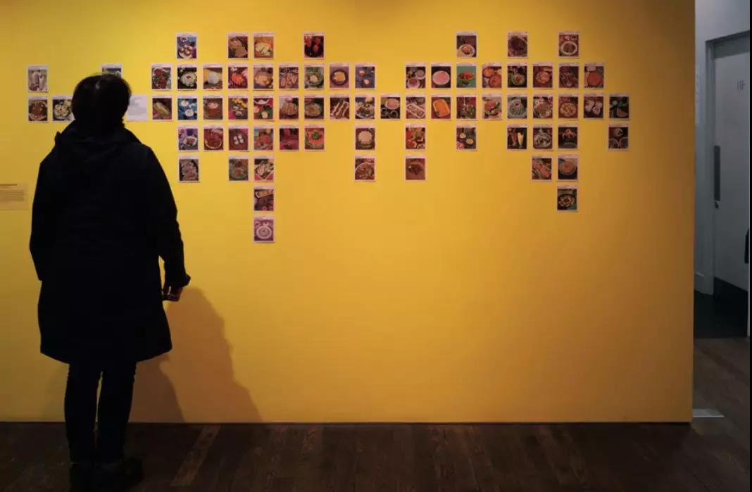 《減肥者食譜卡片》(Weight Watchers Recipe Cards, 1974)幾乎鋪滿了一整面墻。這面墻也最受觀眾歡迎,明黃底色之下,滿墻各式各樣的食物,引發(fā)熱烈討論,時而歡聲笑語,熱鬧若市,引得剛?cè)雸龅挠^眾側(cè)目。粗看之下,這就是一墻食物,細細看來往往都要吸幾口涼氣:這些食物在外形上都有超越常規(guī)審美的模樣,大多濃厚濁膩,用“黑暗料理”形容不為過,有的甚至算得上“邪典料理”……目的何在?——《減肥者食譜卡片》。理論上,減肥需要控制飲食并加強鍛煉,控制飲食的方法不少,遏制食欲無疑能從源頭上解決問題。于是,這些有助于遏制食欲的小卡片應(yīng)運而生,可謂“一本正經(jīng)胡說八道”,難怪觀眾會邊看邊笑。