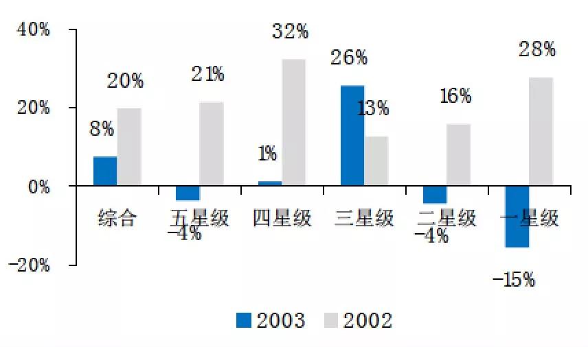 酒店住宿業(yè)當年受到的沖擊非常明顯。2003年,全國星級飯店出租率同比下降4%,收入增速僅為8%,相比2002年的增速下滑12%。低星級收入受到的沖擊更明顯,其中一星級飯店收入增速下滑高達43%,二星級飯店收入增速亦有20%的放緩。
