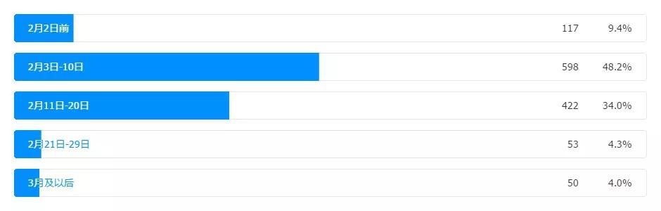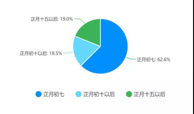 根據(jù)統(tǒng)計結(jié)果來看,62.6%的企業(yè)在疫情未大范圍傳播時的開工時間為正月初七(國家法定假日結(jié)束),18.5%的企業(yè)開工時間為正月初十后,19%的企業(yè)開工時間為正月十五后,基本上符合春節(jié)假期的主流放假時間。