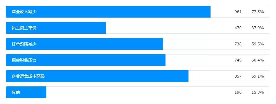 結(jié)合上述第6個問題數(shù)據(jù),分析可以看出,當(dāng)前受疫情影響員工復(fù)工率低,導(dǎo)致企業(yè)既不能進行正常的復(fù)工,還要承擔(dān)員工的工資及五險一金開支,直接造成了入不敷出的困難情況。