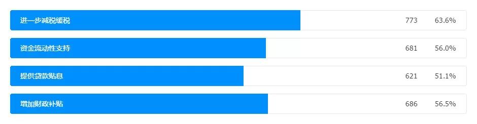 根據(jù)數(shù)據(jù)可以看出,參與調(diào)查的企業(yè)認為,當(dāng)前企業(yè)主要面臨的經(jīng)營困難主要是集中在資金等問題上,面對收入急劇減少,人工成本反而增高的前提下,大多數(shù)民營企業(yè)最需要的,是更多的稅費減免及政府補貼支持。