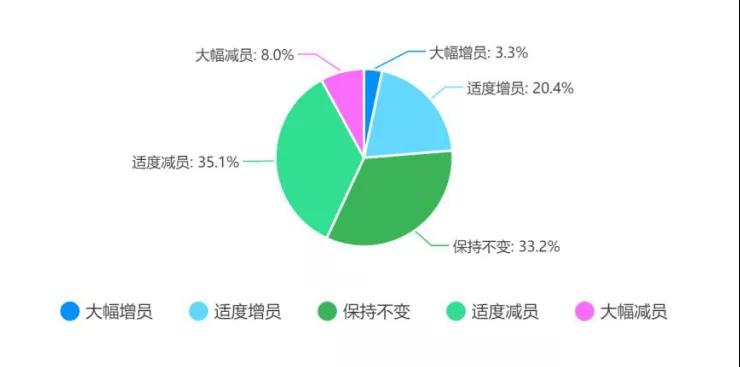 現(xiàn)有數(shù)據(jù)可以看出,當(dāng)前企業(yè)對于企業(yè)發(fā)展的態(tài)勢都持觀望態(tài)度,導(dǎo)致企業(yè)在用工方面體現(xiàn)出比較保守的選擇:超過33%的企業(yè)將會保持本企業(yè)的用工情況,不進行進一步的擴張,而超過35%的企業(yè)將會通過適度裁員的情況來緩解當(dāng)前企業(yè)的困境。值得注意的是,有8%的企業(yè)表示將會以大幅裁員緩解企業(yè)困境,可見企業(yè)對于本次疫情對于經(jīng)濟的負面影響普遍比較擔(dān)心。
