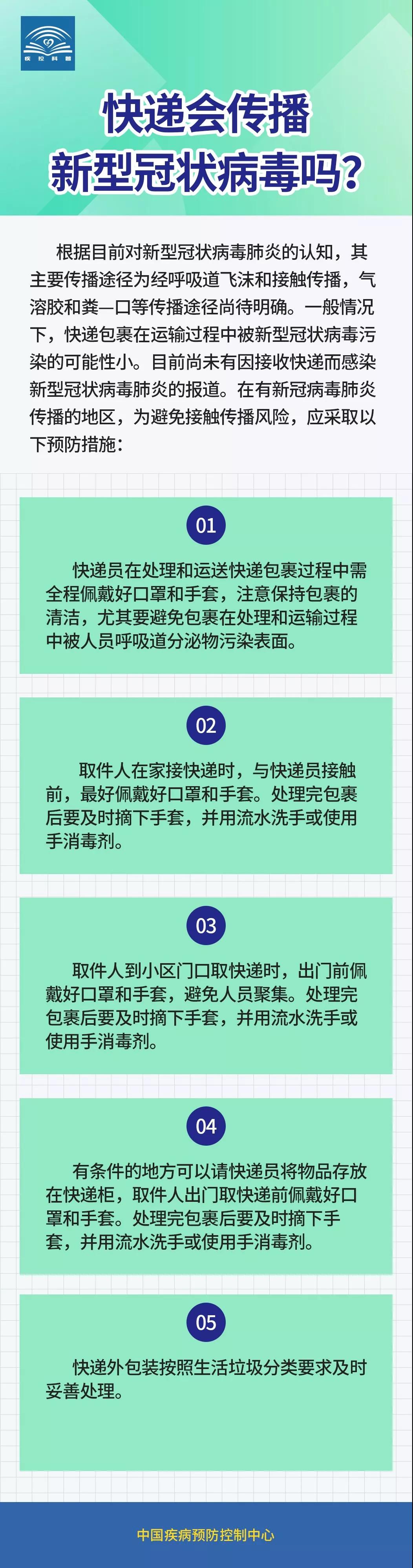 疫情之下,網(wǎng)上購物成為很多人獲取生活物資的首選方式,但也引發(fā)了一些擔憂,快遞會傳播新型冠狀病毒嗎?我們該如何更好地保護自己?中國疾控中心提示,快遞包裹在運輸過程中被新型冠狀病毒污染的可能性小,目前尚未有因接收快遞而感染新冠肺炎的報道。