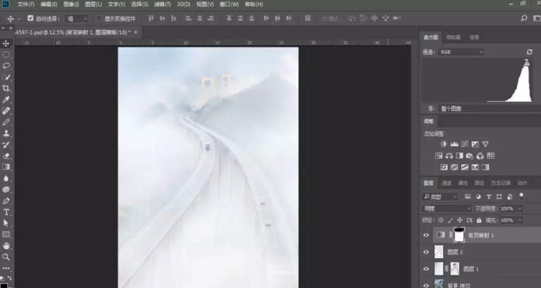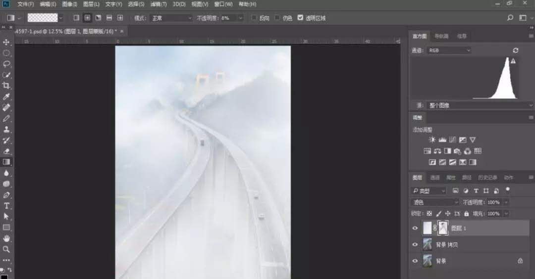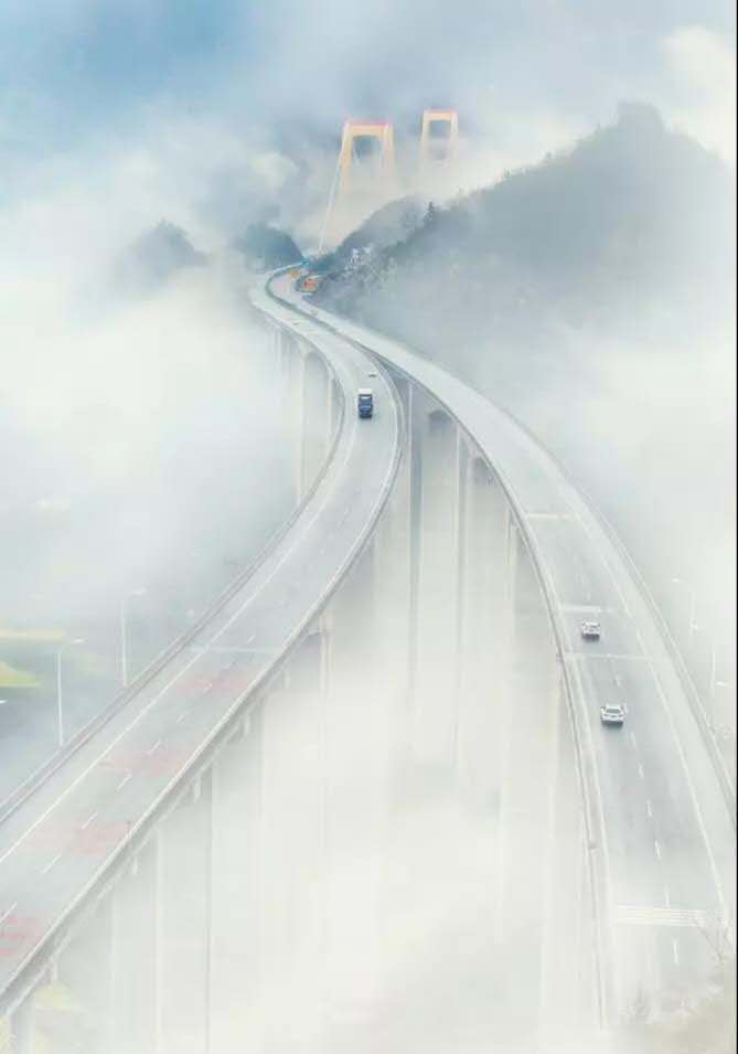 對(duì)原圖作適當(dāng)?shù)牟眉?,使畫面更加?jiǎn)潔。用矩形套索工具選取部分云霧,通過(guò)自由變換覆蓋整個(gè)畫面,選擇濾鏡-模糊-高斯模糊,對(duì)新圖層進(jìn)行模糊處理,使云霧更自然,選擇圖層混合模式為濾色,并為該圖層建立蒙版,點(diǎn)擊“漸變工具”,選擇從前景色黑到背景色白的漸變,再選擇“徑向漸變”,前景色為黑色,用不透明度8%左右,編輯蒙板,擦出高架橋的部分,最后對(duì)該蒙版作適當(dāng)?shù)挠鸹?/span>