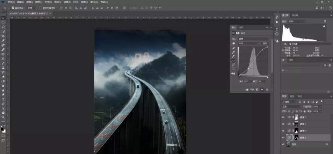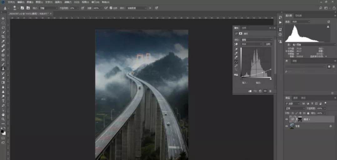 回到背景圖層,再選擇快速選擇工具(屬性中選擇添加選區(qū))選擇兩條高速路執(zhí)行曲線調(diào)整層工具,通過(guò)S型曲線調(diào)整加強(qiáng)高速路的反差,點(diǎn)擊曲線調(diào)整層蒙版滑動(dòng)下羽化滑塊,稍微羽化選區(qū)。通過(guò)這一步驟調(diào)整目的是加強(qiáng)高速路的質(zhì)感。