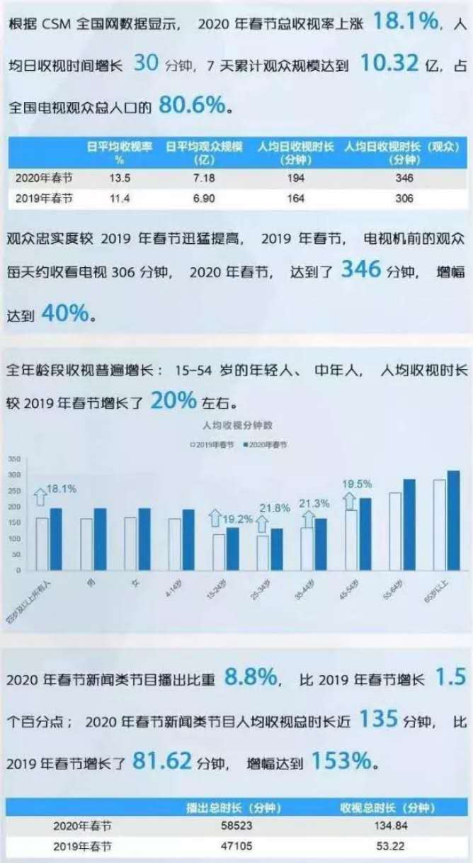 足不出戶、居家過(guò)年成為2020年全國(guó)人民的春節(jié)度假模式,電視再次彰顯出強(qiáng)者的力量。觀眾忠實(shí)度較2019年春節(jié)迅猛提高,2019年春節(jié),電視機(jī)前的觀眾每天約收看電視306分鐘,2020年春節(jié),達(dá)到了346分鐘,增幅達(dá)到40%。