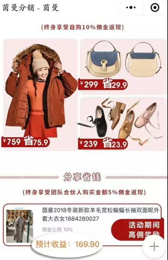 從淘寶電商起家的茵曼反應(yīng)更為迅速,疫情爆發(fā)后聯(lián)動了600多家門店開展社群營銷,利用小程序、朋友圈、微信群等方式,引導(dǎo)顧客消費。此外,茵曼對外招募了1萬名“茵曼推手”。只需在茵曼小程序掃碼下單滿100元,便可成為“茵曼推手”,有效期為180天,“推手”們可享受最高達實付金額20%的推廣傭金。
