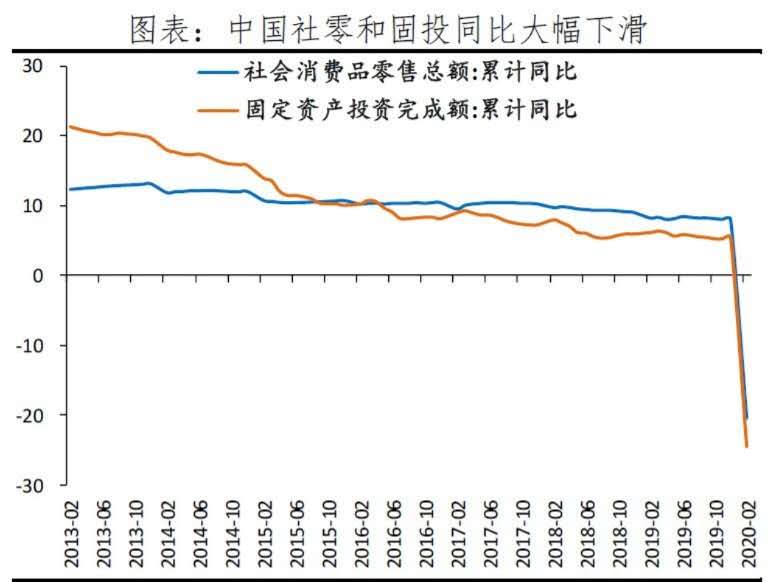 以中國為例,2020年1-2月,中國社會(huì)消費(fèi)品零售總額和固定資產(chǎn)投資完成額累計(jì)同比分別從2019年12月的8.0%和5.4%下滑至-20.5%和-24.5%,工業(yè)增加值累計(jì)同比從5.7%下滑至-13.5%,2月制造業(yè)PMI從1月的50.0下滑至35.7,均創(chuàng)數(shù)據(jù)公布以來的最低值,遠(yuǎn)超2003年SARS和2008年國際金融危機(jī)。一季度GDP大概率負(fù)增長。