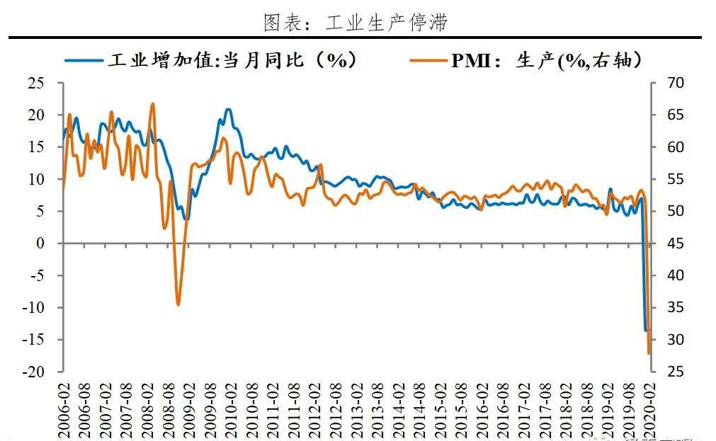 受疫情沖擊,中國1-2月經(jīng)濟暫時停擺,生產(chǎn)投資消費冰封,經(jīng)濟數(shù)據(jù)暴跌,一季度GDP已鐵定負增長。代價沉重,勝利來之不易。1-2月規(guī)模以上工業(yè)增加值同比-13.5%,2019年12月為6.9%。1-2月城鎮(zhèn)固定資產(chǎn)投資(不含農(nóng)戶)同比-24.5%,2019年為5.4%。1-2月房地產(chǎn)開發(fā)投資同比-16.3%,2019年為9.9%。1-2月社會消費品零售總額同比-20.5%,2019年12月為8%。2月新增社會融資規(guī)模為8554億元,比上年同期少增1111億元。