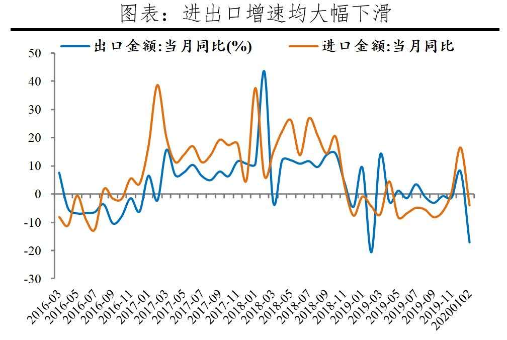 出口大幅下滑,主因疫情導致部分國家對華貿(mào)易管制以及國內(nèi)企業(yè)延遲復(fù)工;進口增速下滑幅度不及出口,貿(mào)易差額由正轉(zhuǎn)負。1-2月中國出口(以美元計)累計同比-17.2%,較去年12月下滑25.1個百分點;進口(以美元計)累計同比-4.0%,下滑20.5個百分點;貿(mào)易差額-71億美元,減少543.1億美元。出口方面,對主要地區(qū)均不同程度下滑,勞動密集型產(chǎn)品出口下滑幅度最大。1-2月中國對美國、歐盟、日本、東盟、中國香港和韓國的出口累計同比分別為-27.7%、-18.4%、-24.5%、-5.1%、-20.4%和-18.6%,均較去年12月下滑10個百分點以上;七大勞動密集型產(chǎn)品、機電產(chǎn)品和高新技術(shù)產(chǎn)品出口累計同比分別為-26.3%、-16.2%和-15.2%,均下滑15個百分點以上。進口方面,大宗商品進口同比較上月上升。1-2月農(nóng)產(chǎn)品、機電產(chǎn)品、高新技術(shù)產(chǎn)品進口累計同比分別為5.1%、-7.4%、-5.4%,均較12月下滑20個百分點以上;大宗商品進口累計同比為15.0%,較12月上升3.8個百分點。