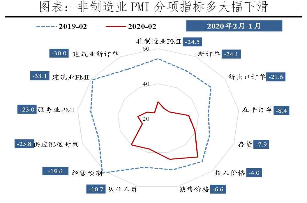 2月制造業(yè)PMI指數(shù)為35.7%,較上月大幅下滑14.3個百分點,低于2008年11月全球金融危機時的38.8%。分項來看:1)生產(chǎn)放緩。2月PMI生產(chǎn)指數(shù)為27.8%,較上月大幅下滑23.5個百分點,與疫情沖擊下企業(yè)延遲復(fù)工、生產(chǎn)停滯有關(guān)。2)內(nèi)外需求疲弱。2月新訂單和新出口訂單指數(shù)分別為29.3%和28.7%,分別較上月大幅下滑22.1和20.0個百分點。3)價格指數(shù)下滑,企業(yè)虧損和通縮風險加大。2月原材料和出廠價格指數(shù)分別為51.4%和44.3%,較上月分別下滑2.4和4.7個百分點。出廠價格和原材料價格指數(shù)差值擴大,中下游企業(yè)盈利壓力加大。4)采購量和經(jīng)營預(yù)期指數(shù)大幅下滑,原材料庫存大降、產(chǎn)成品庫存積壓。2月原材料庫存指數(shù)較上月下滑13.2個百分點,后期有較強補庫存需求;產(chǎn)成品庫存指數(shù)較上月上升0.1個百分點,反映疫情期間物流堵塞、消費放緩導致的庫存積壓。5)大中小型企業(yè)PMI均大幅下滑,中小企業(yè)受沖擊更大。2月大中小型企業(yè)PMI指數(shù)分別為36.3%、35.5%和34.1%,較上月分別下滑14.1、14.6和14.5個百分點。