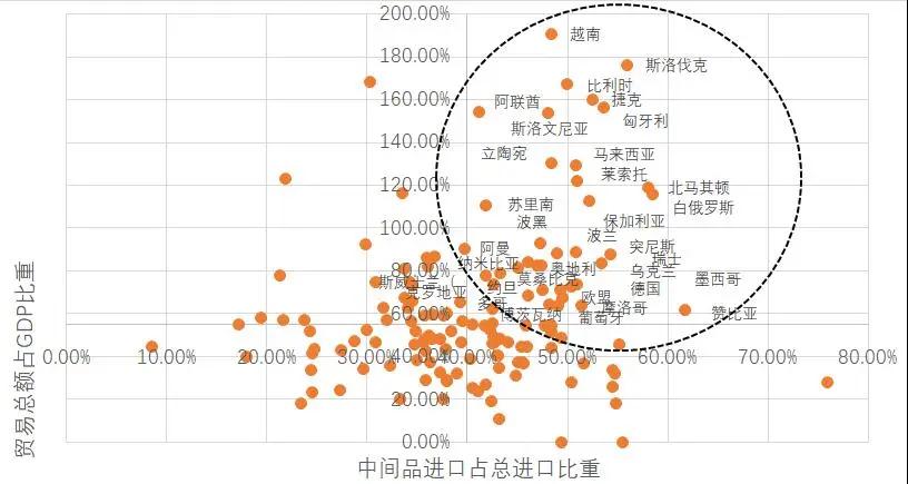 如圖所示,對國際貿(mào)易依賴程度更高、與國際供應(yīng)鏈聯(lián)系更強、且從中國進口中間品較多的國家大多都是發(fā)展中國家,幾乎沒有發(fā)達(dá)經(jīng)濟體。當(dāng)然,在部分產(chǎn)業(yè)中有些發(fā)達(dá)國家和中國在生產(chǎn)和消費環(huán)節(jié)的聯(lián)系非常緊密,如電子產(chǎn)業(yè)中以中日韓為核心形成了東亞生產(chǎn)體系,汽車產(chǎn)業(yè)中德國對中國的終端需求依賴度較高。