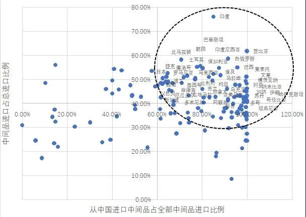 我們試圖從另一個角度,更為直接地測度新冠疫情對全球供應(yīng)鏈帶來的供給沖擊。我們的研究思路是:通過原始而真實的國際貿(mào)易數(shù)據(jù),找出那些更容易受到中國沖擊的國家。這些國家進口了更多的中國產(chǎn)品,尤其是中間產(chǎn)品。進口中間品的目的是進入國內(nèi)的生產(chǎn)環(huán)節(jié),顯然對該國生產(chǎn)的影響更為直接。找到了這些更容易受到?jīng)_擊的國家之后,我們就可以根據(jù)這些國家的分布和規(guī)模,判斷新冠疫情對全球供應(yīng)鏈帶來的供給沖擊。