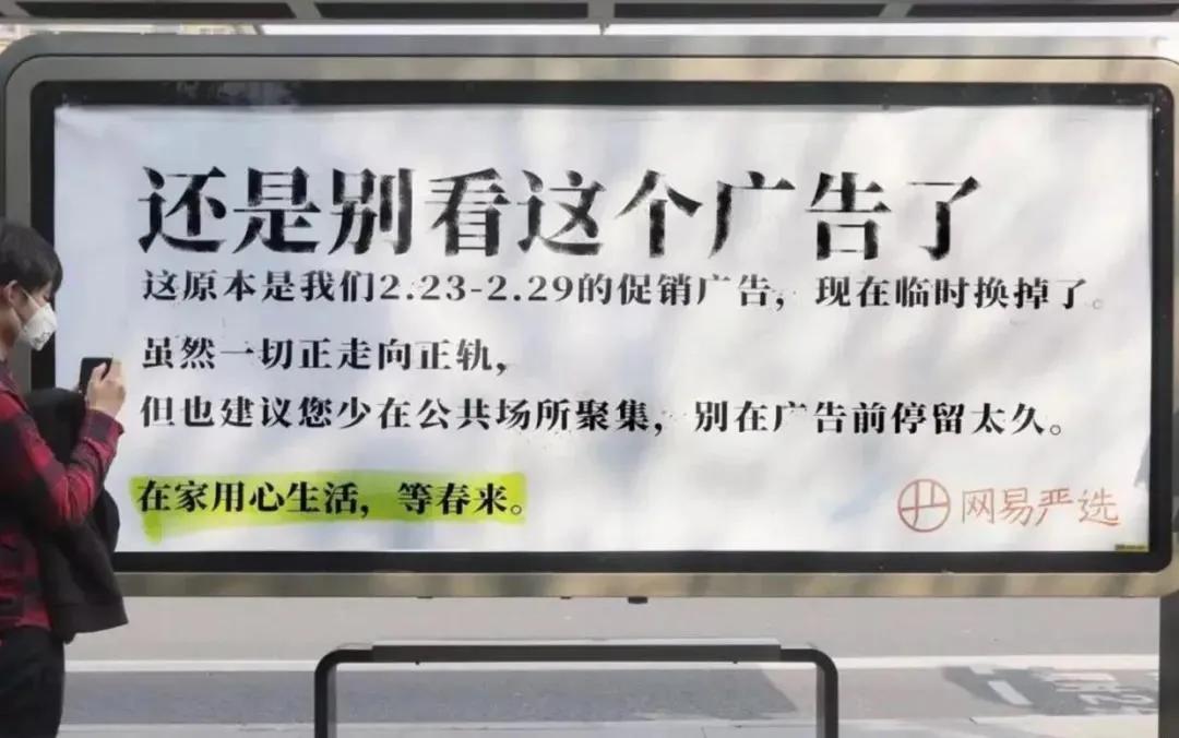 近日,在某中心商場(chǎng)附近的網(wǎng)易嚴(yán)選特殊戶外廣告“還是別看這個(gè)廣告了”刷屏。廣告牌上寫著:“還是別看這個(gè)廣告了,這原本是我們2.23-2.29的促銷廣告,現(xiàn)在臨時(shí)換掉了。雖然一切正走向正軌,但也建議您少在公共場(chǎng)合聚集,別在廣告前停留太久。在家用心生活,等春來(lái)。”網(wǎng)易嚴(yán)選將廣告作為溫馨提醒,勸用戶不要看,不要聚眾,既展現(xiàn)了創(chuàng)意又傳遞了溫度。