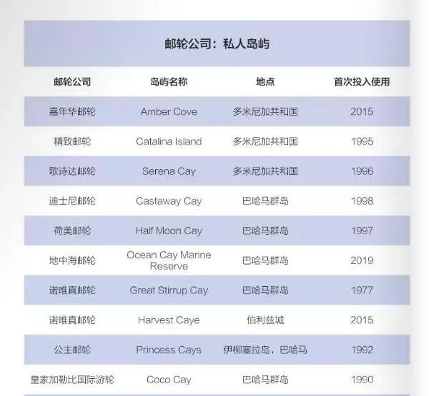 郵輪公司的私人島嶼幾家經(jīng)營(yíng)巴哈馬/加勒比海航線的郵輪公司都設(shè)有“私人島嶼沙灘日”行程。諾唯真郵輪在1977年購(gòu)買了一個(gè)此前為軍事哨所的島嶼,引領(lǐng)了郵輪公司購(gòu)買私屬島嶼的新趨勢(shì)。到目前為止,諾唯真已經(jīng)花費(fèi)數(shù)百萬美元用于升級(jí)島上設(shè)施。