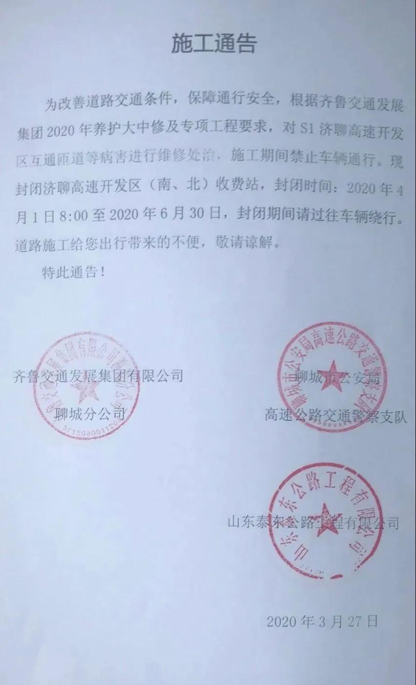 因濟聊高速開發(fā)區(qū)互通立交施工需要,2020年4月1日8:00至2020年6月30日,封閉濟聊高速聊城開發(fā)區(qū)收費站(南北崗),封閉期間請過往車輛繞行,道路施工給您出行帶來的不便,敬請諒解。