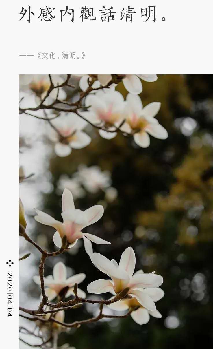 清明,我們又一次進入化文的狀態(tài)。細(xì)雨紛紛,煙柳垂淚,行人斷魂,是對逝者的緬懷和尊敬;萬物生長,惠風(fēng)和暢,天清地明,是對生者的祝福和期待;萬物有靈,春發(fā)幾枝,懵懂初醒,是對靈者的啟示和生發(fā)……