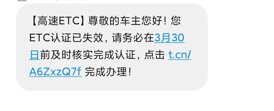 ETC不存在過期再認(rèn)證,針對“ETC認(rèn)證失效”類的短信很可能是騙子群發(fā)的釣魚短信,短信中的鏈接其實(shí)是騙子用來套取個(gè)人信息,從而盜取卡內(nèi)資金的手段,請廣大市民切勿相信!