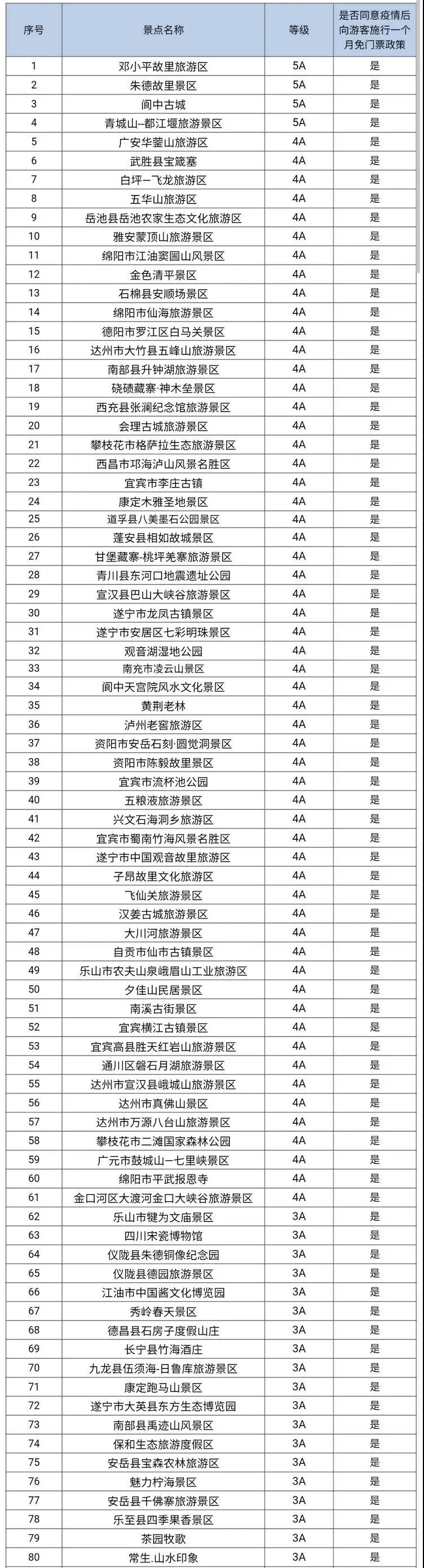 4月1日,四川省旅游景區(qū)協(xié)會公布,全省112個景區(qū)在4月對所有游客免門票!實行免費景區(qū)名單如下: