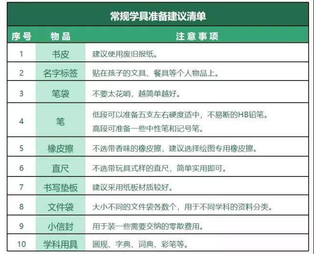 開學(xué)前,家長(zhǎng)可以幫助低段的孩子共同討論一個(gè)學(xué)具準(zhǔn)備清單,高段的孩子可以自主準(zhǔn)備。給家長(zhǎng)們提供了一份清單,僅供參考。