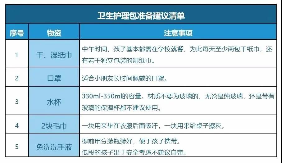除了學(xué)具的準(zhǔn)備外,家長(zhǎng)可以跟孩子做好疫情期間的抗疫物品準(zhǔn)備。比如,可以準(zhǔn)備個(gè)衛(wèi)生護(hù)理包,護(hù)理包里準(zhǔn)備兩個(gè)口罩,一些濕紙巾,兩包干紙巾,條件允許的話還可以準(zhǔn)備免洗的洗手液或者消毒液,或者一次性的小方巾。