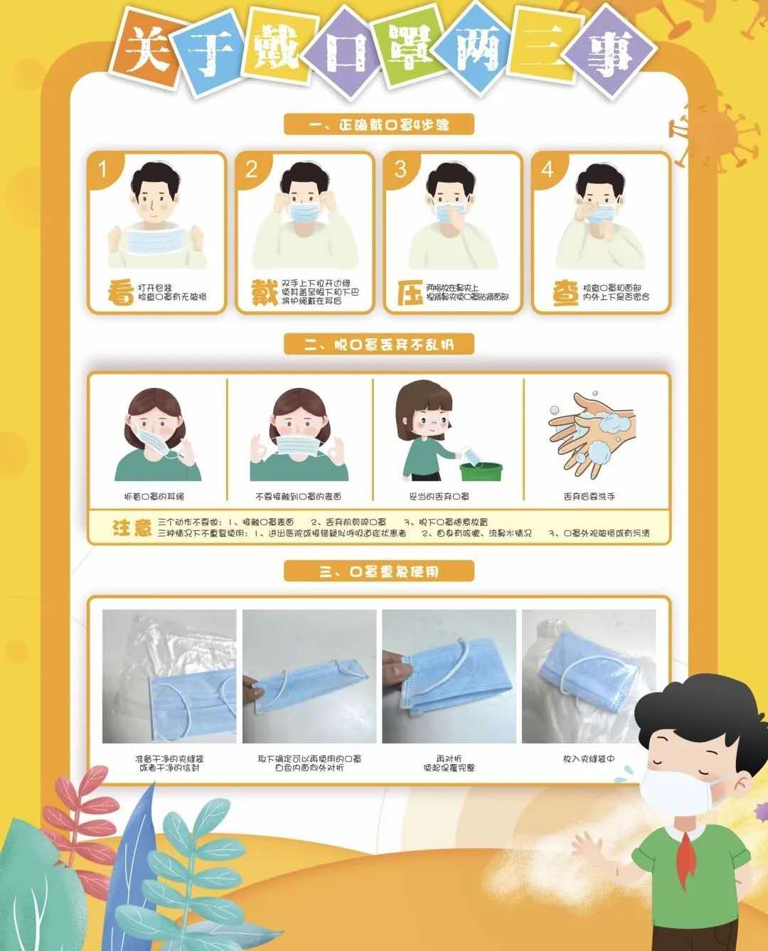 4.可以教下孩子如何正確使用口罩,特別是在學(xué)校吃午飯期間,如何正確取下口罩,同時(shí)不要用雙手觸摸口罩朝外的部分。