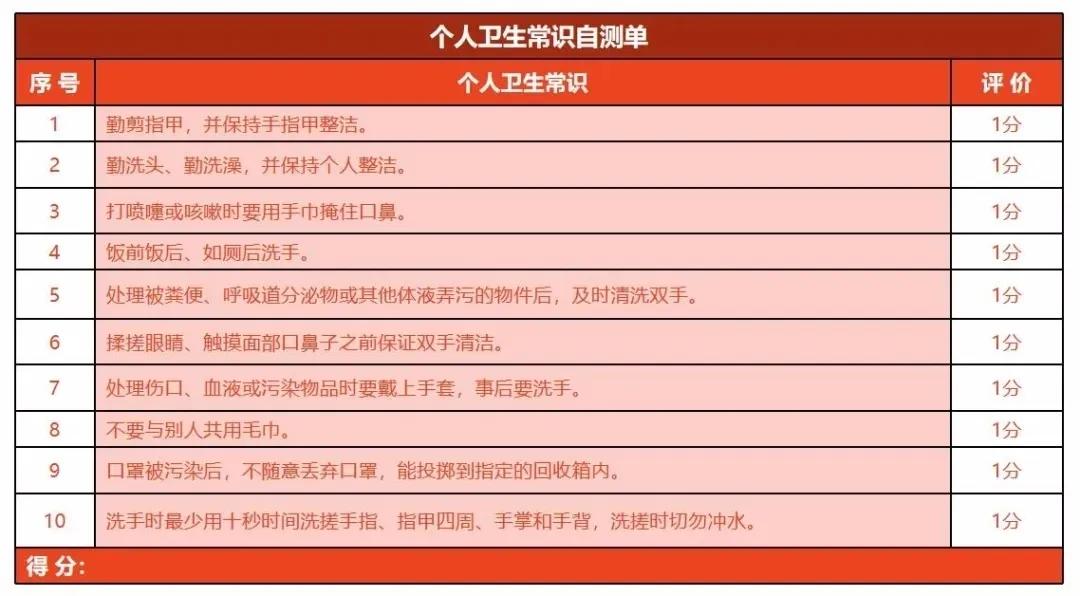 在家里提前與孩子學(xué)習(xí)個(gè)人衛(wèi)生的相關(guān)知識(shí),增強(qiáng)自我保護(hù)意識(shí)。這里,也給大家總結(jié)了一些自我保護(hù)的自測(cè)單,可以做到的話+1分。