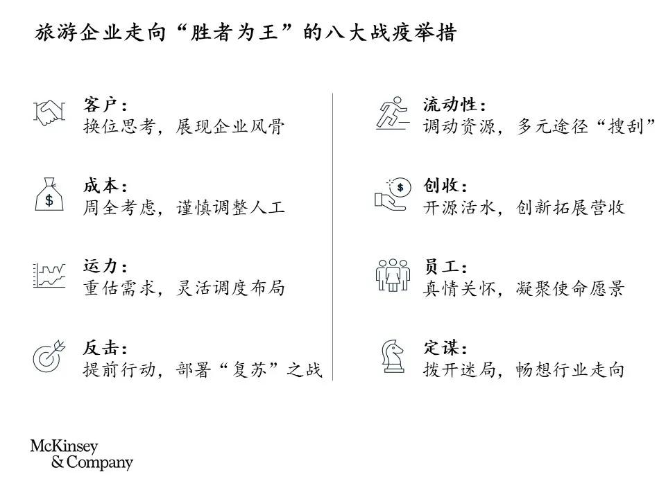 麥肯錫結(jié)合自身在旅游行業(yè)的豐富咨詢經(jīng)驗(yàn),以及過去幾周的重點(diǎn)調(diào)查研究,總結(jié)出針對旅游企業(yè)的八大戰(zhàn)“疫”舉措。這些舉措詳細(xì)闡明了克服短期現(xiàn)金流危機(jī)的方法,以及企業(yè)應(yīng)在恢復(fù)期中如何謀篇布局,希望能為廣大旅游企業(yè)提供一些參考,并與全行業(yè)共勉。