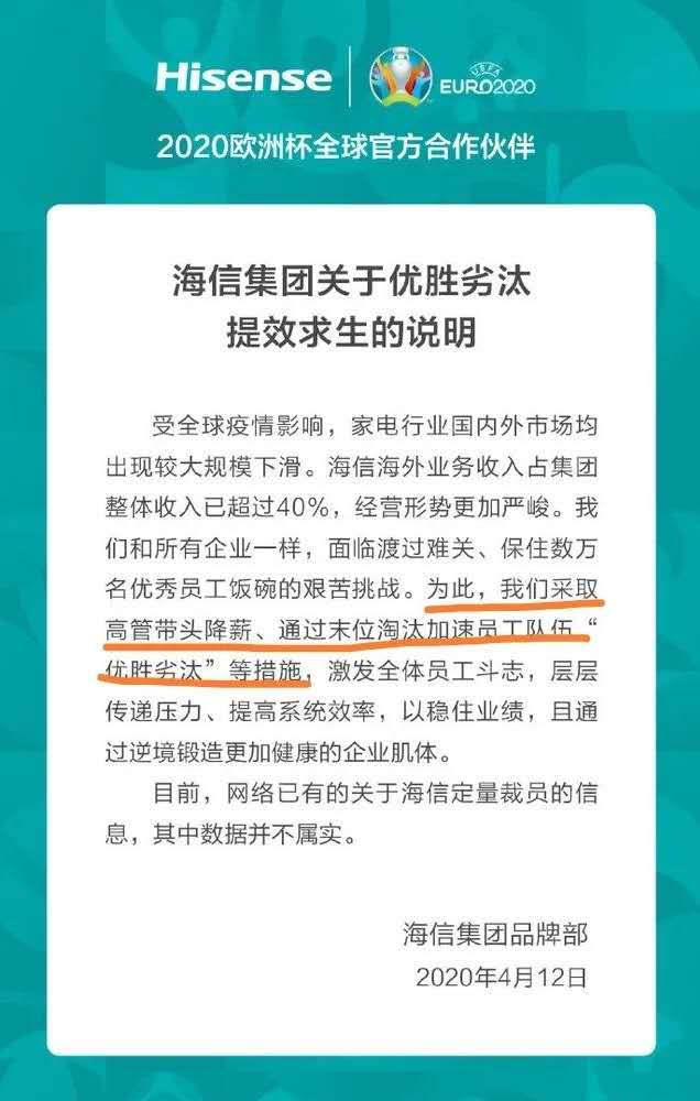 海信集團(tuán)采取高管帶頭降薪、通過末位淘汰加速員工隊伍“優(yōu)勝劣汰”等措施,激發(fā)全體員工斗志,層層傳遞壓力、提高系統(tǒng)效率,以穩(wěn)住業(yè)績,且通過逆境鍛造更加健康的企業(yè)肌體。”