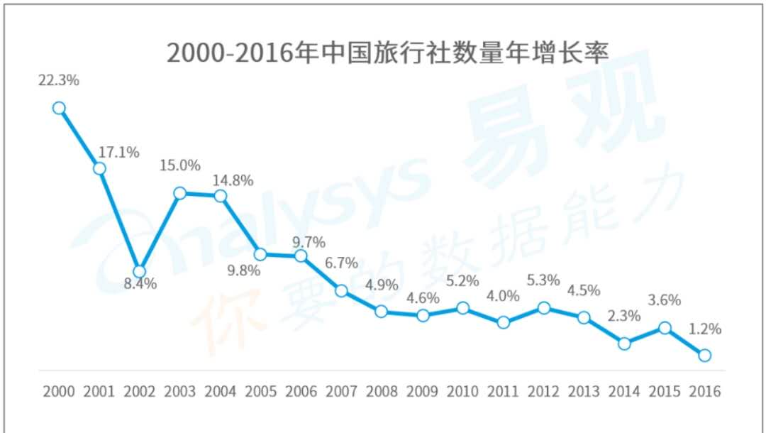 2000-2016年中國(guó)旅行社數(shù)量年增長(zhǎng)率