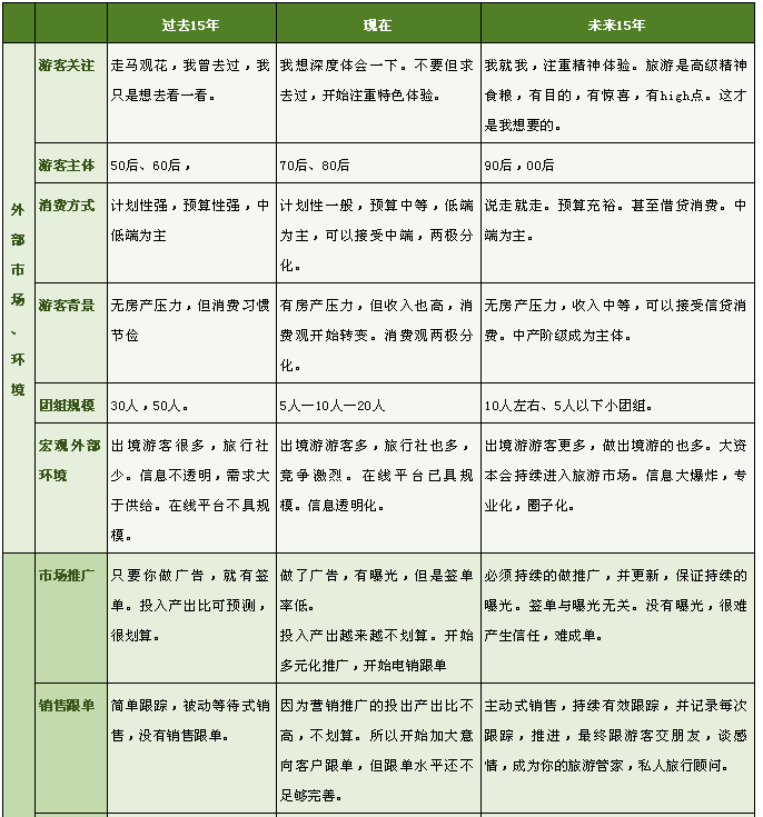 請(qǐng)看以下的分析,從外部環(huán)境,游客主體,產(chǎn)品趨勢(shì),等幾個(gè)方面,綜合對(duì)比過(guò)去十五年,現(xiàn)在,和未來(lái)十五年的一個(gè)變化和趨勢(shì)。