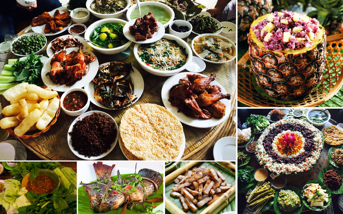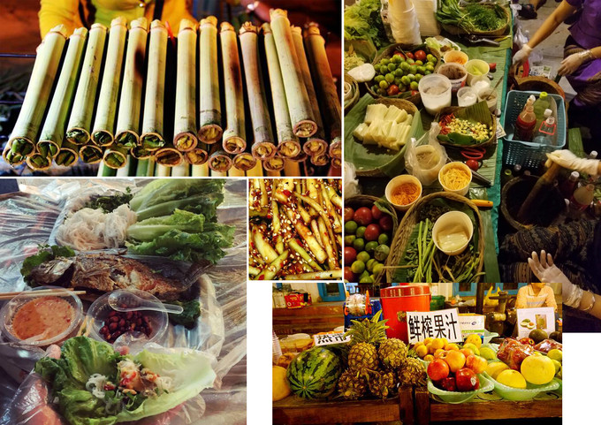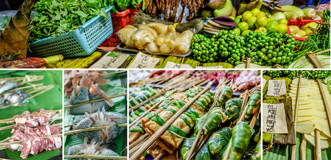 例如香茅草烤魚、考五花肉、烤雞、菠蘿飯、野菜湯、風(fēng)味煮米干、喃咪拼盤都非常值得一試。特具風(fēng)味的野菜,不僅美味,四季皆不同。你要是選擇雨季來版納,不僅有山茅野菜、筍類,還有野生菌類和讓你勇于挑戰(zhàn)的蟲類,豐富的程度絕對讓你咂舌。