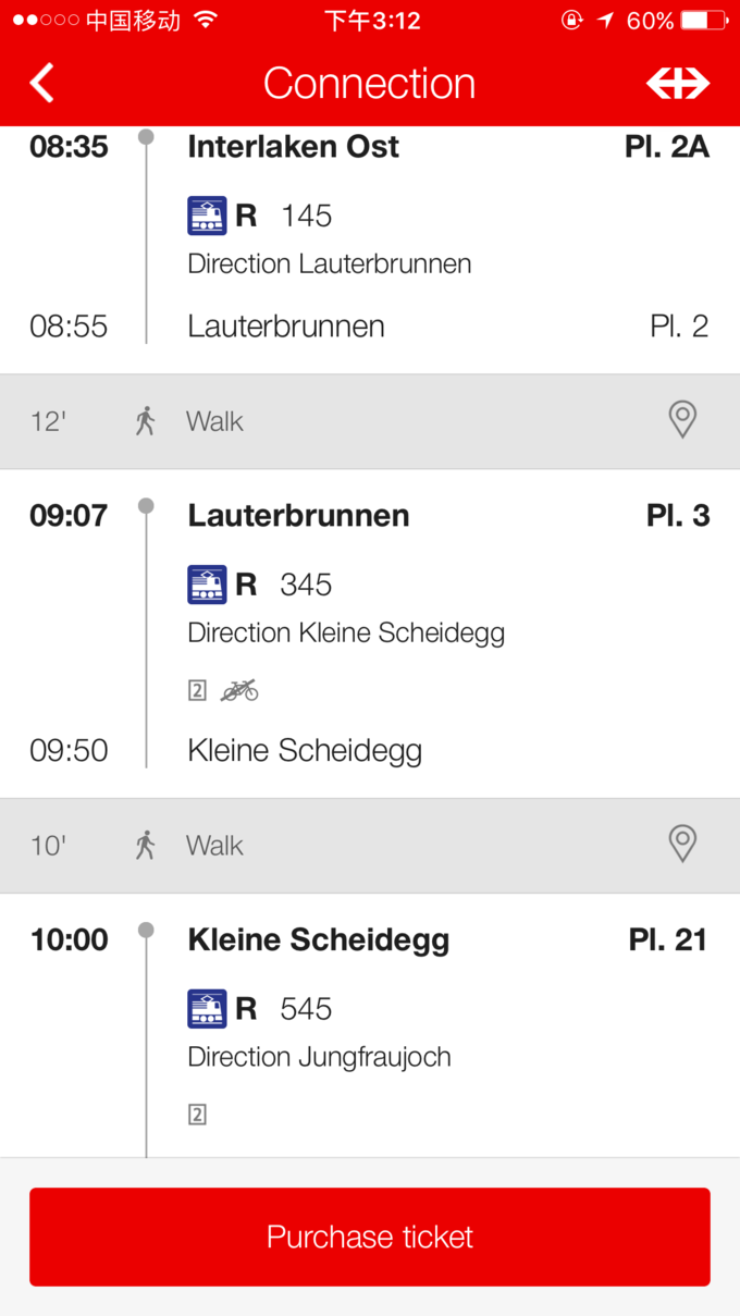 少女峰登山火車在Interlaken Ost發(fā)車。登山火車要分三段走,即兩次換乘,坐三趟小火車。