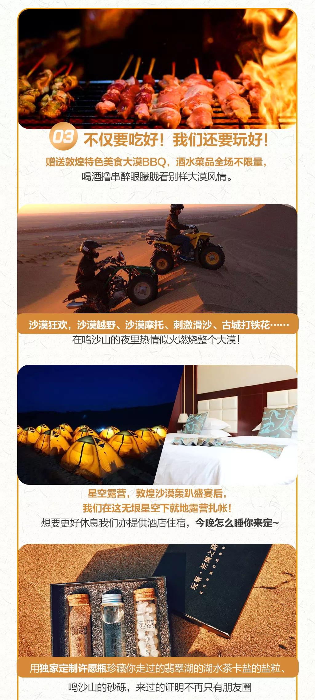 晚上在敦煌來一場(chǎng)絕無僅有的沙漠轟趴盛宴,沙漠越野、沙漠摩托、刺激滑沙、古城打鐵花……花樣玩法,玩累了咱們就坐地品嘗特別贈(zèng)送的沙漠BBQ,酒水菜品全場(chǎng)不限量,大家圍繞著篝火舞蹈,聞著燒烤的炭火香,暢飲著啤酒,品嘗已然備好的燒烤,在鳴沙山的夜里熱情似火燃燒整個(gè)大漠!