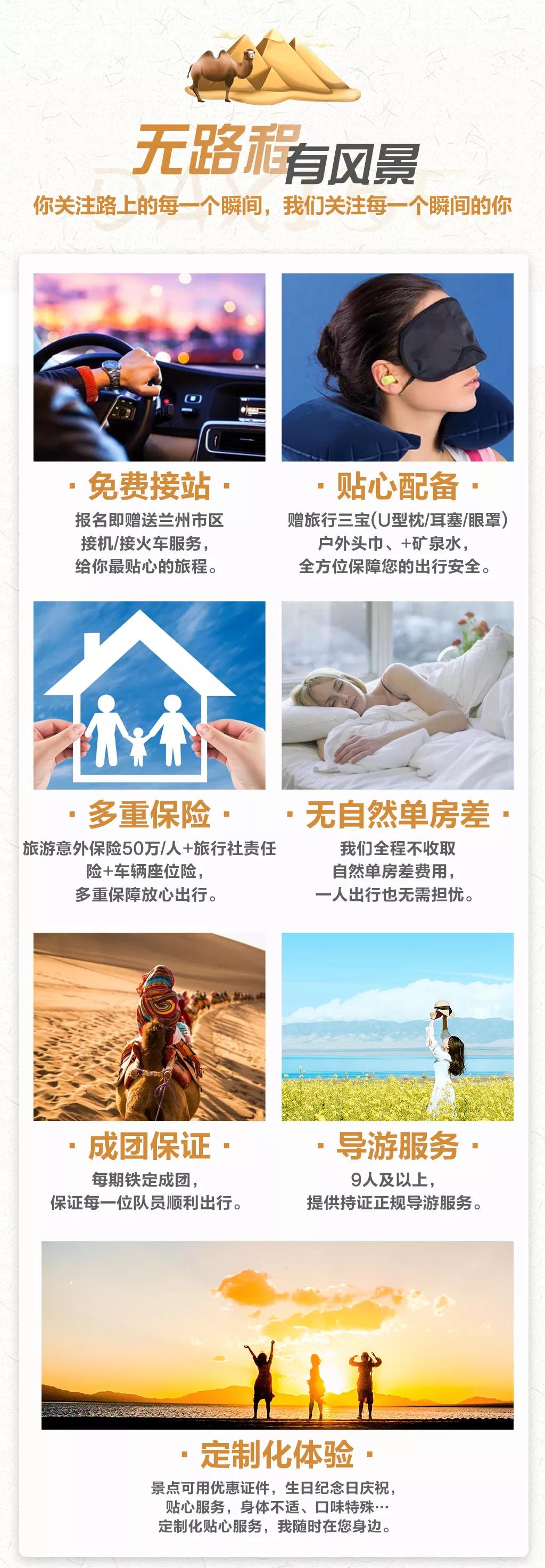贈(zèng)送:贈(zèng)送特色敦煌沙漠BBQ;特贈(zèng)獨(dú)家定制許愿瓶禮盒,許你獨(dú)家記憶;贈(zèng)送貼心禮包旅游三寶、魔術(shù)頭巾、礦泉水;贈(zèng)送蘭州市區(qū)接機(jī)/接火車服務(wù),23點(diǎn)后由于運(yùn)管規(guī)定不能接機(jī)/接站,敬請(qǐng)諒解。(贈(zèng)送項(xiàng)目不用費(fèi)用不退)